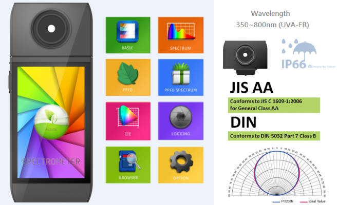 El espectrómetro PG200N es un medidor PBAR (radiación fotobiológicamente activa) que sirve para medir la cantidad y calidad de la luz para una nueva generación de agricultores/investigadores que cultivan en interior y que, utilizan la iluminación artificial como sustituto o complemento de la luz solar.